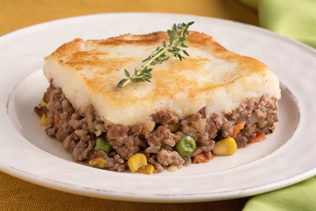 Ground beef, vegetables, and topped with creamy mashed potatoes