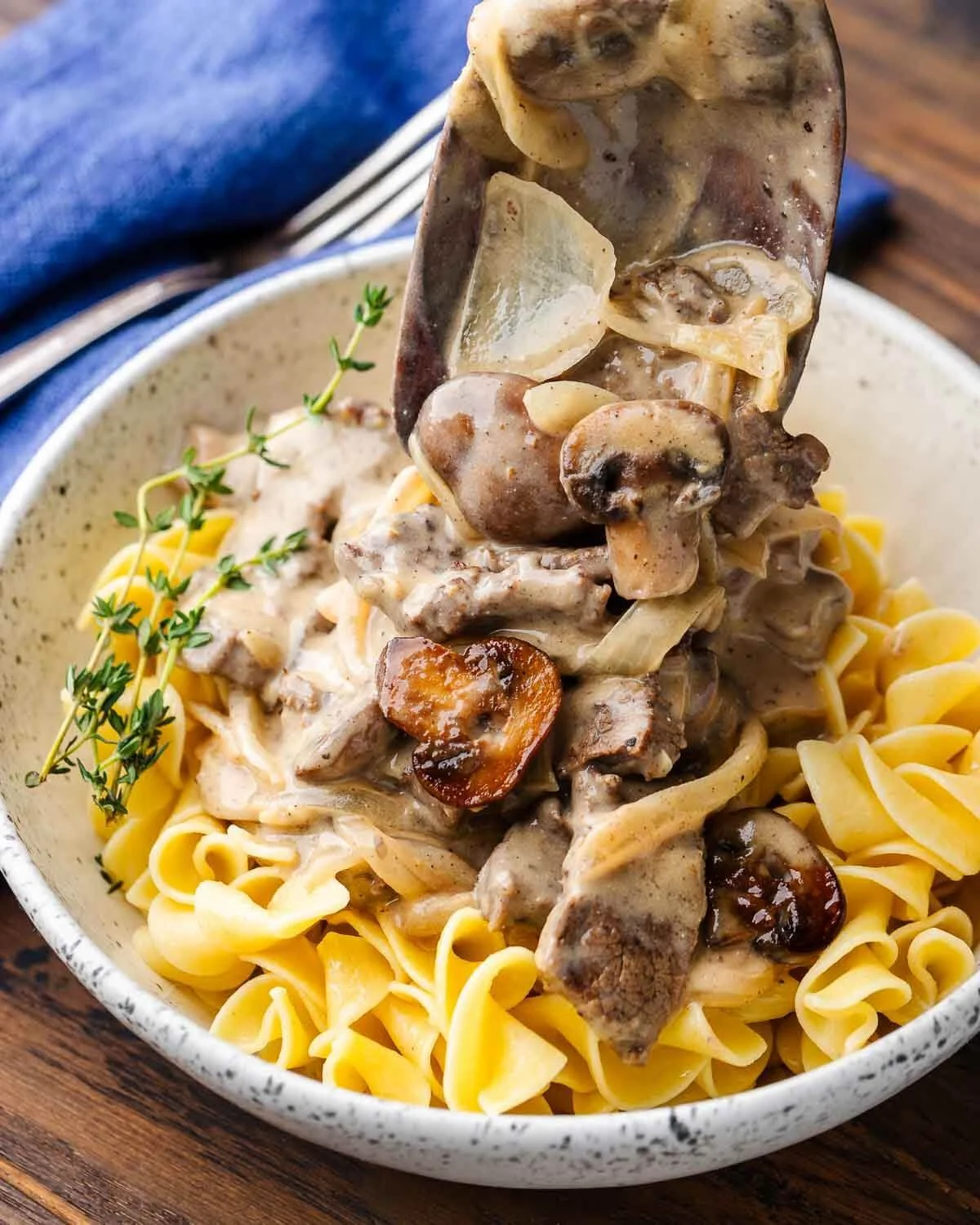 Tender beef cooked in a creamy mushroom sauce served over egg noodles