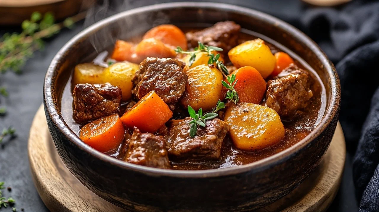 Slow-cooked beef with carrots, potatoes, and peas in a savory broth